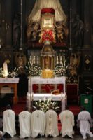 Sanktuarium w Miedniewicach znajduje się pod opieką ojców Franciszkanów konwentualnych jednak w kompleksie klasztornym mieszkają również siostry Klaryski. Siostry, w trakcie spotkania, opowiedziały nam o swojej założycielce ? św. Klarze z Asyżu, charyzmacie zakonu, jakim jest ubóstwo i towarzyszenie ludziom pomimo pozornego zamknięcia na świat w murach zakonu. Po spotkaniu z siostrami zwiedziliśmy sanktuarium pod przewodnictwem o. Mirosława, który przybliżył nam historię sanktuarium i znajdującego się w nim cudownego wizerunku św. Rodziny. Następnie uczestniczyliśmy w Eucharystii, w czasie której zostało przypomniane znaczenie pokory w życiu każdego człowieka, a szczególnie przyszłego kapłana. Powinna być ona przeżywana na wzór doskonałej pokory Najświętszej Maryi Panny. Na zakończenie Mszy Świętej w Akcie Zawierzenia oddaliśmy Matce Bożej siebie samych oraz rozpoczynający się nowy rok studiów. Nasze pielgrzymowanie zakończyła wspólna modlitwa różańcowa.