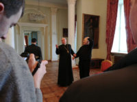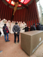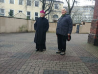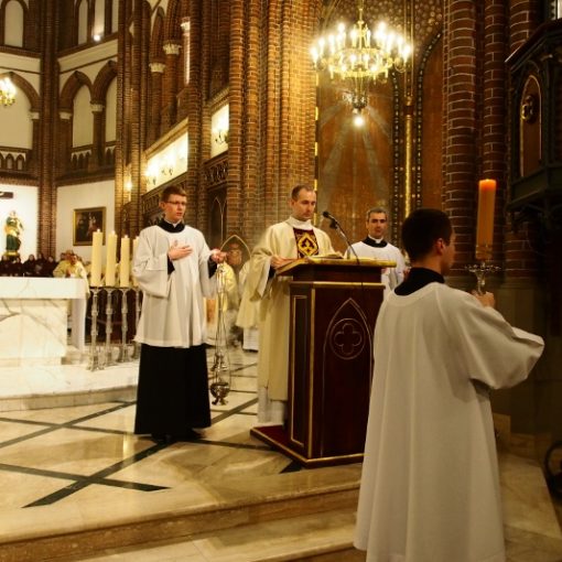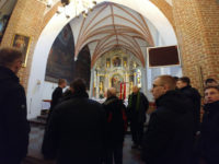 Pierwszym punktem naszego wyjazdu był Włocławek, którego zwiedzanie rozpoczęliśmy od zapory wodnej, z której wrzucono do Wisły bł. ks. Jerzego Popiełuszkę. Po krótkiej modlitwie do męczennika, który był uczniem ks. Starowieyskiego, udaliśmy się do Katedry we Włocławku – kościoła gotyckiego, którego konsekracja miała miejsce w 1411 roku w obecności króla Władysława Jagiełły, jako wotum za zwycięstwo odniesione pod Grunwaldem. Jest tam kaplica, w której przyjął święcenia kapłańskie prymas tysiąclecia ? Stefan kardynał Wyszyński. Po obiedzie w tamtejszym seminarium duchownym, będącym jednym z najstarszych w Polsce (w przyszłym roku będzie obchodzić 450 utworzenia), odwiedziliśmy najpierw emerytowanego biskupa Włocławskiego, ks. bp. Bronisława Dembowskiego, który akurat tego dnia obchodził 26 lecie sakry biskupiej. Odśpiewaliśmy mu „Plurimos annos” i przeszliśmy do pałacu biskupiego, gdzie oczekiwał już na nas przy stole pełnym wielkanocnych mazurków ordynariusz diecezji – ks. bp Wiesław Mering. Takie spotkania z biskupami, są bardzo ubogacające, dają nowe spojrzenie na wiele spraw, z którymi będziemy mieć styczność na co dzień w naszej pracy duszpasterskiej. Na koniec wyruszyliśmy do Gdańska, do kościoła św. Wojciecha, gdzie uczestniczyliśmy we mszy świętej. Ostatecznie dojechaliśmy do Straszyna, domu rekolekcyjnego Archidiecezji Gdańskiej, który był naszą bazą noclegową.